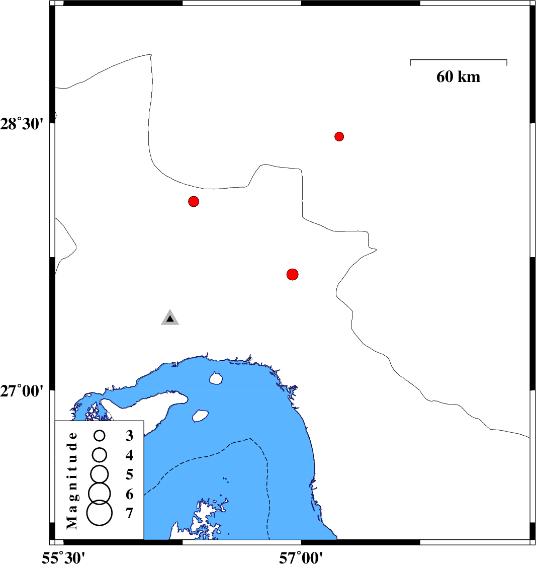 | 2017/04/28 | 05:07:08.3 | 09:37:08.3 | 27.652 | 56.944 | 14 | ML:3.2 | Hormozgan Province, 38 km North-West of Dehbarez | ||