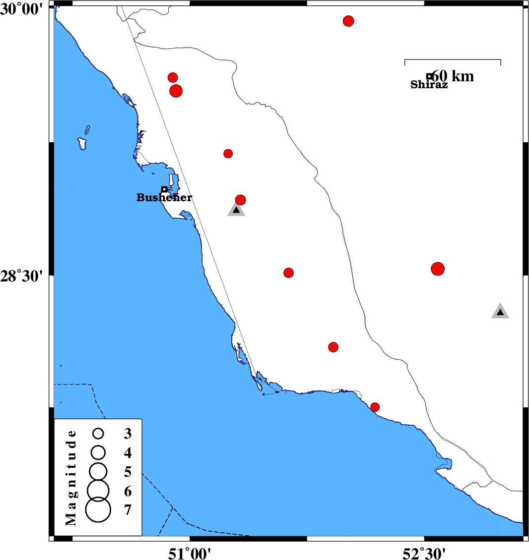 | 2017/04/22 | 05:01:57.4 | 09:31:57.4 | 28.925 | 51.325 | 14 | ML:3 | Bushehr Province, 8 km of Ahram | ||
