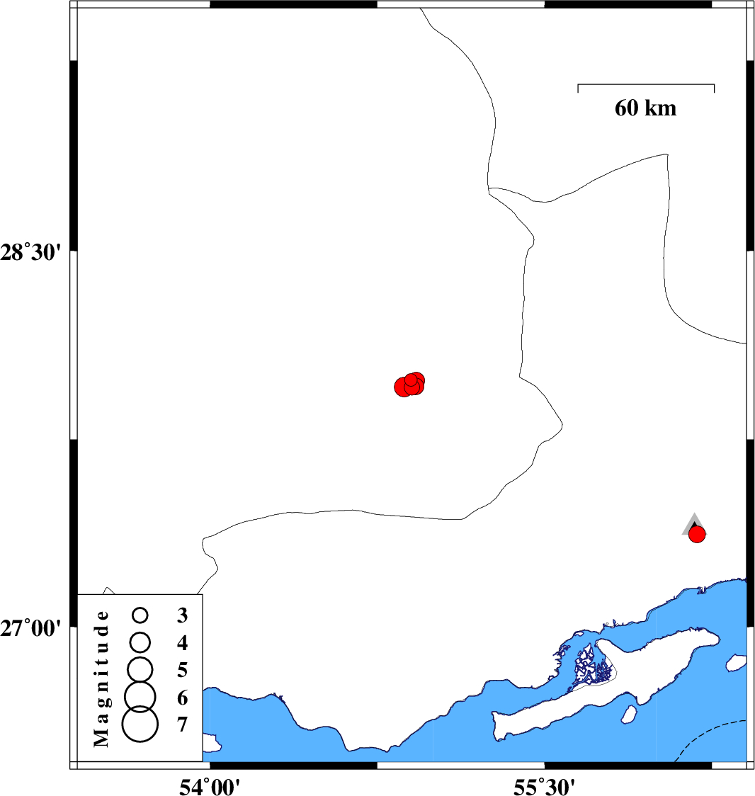 | 2017/04/28 | 13:00:44.8 | 17:30:44.8 | 27.958 | 54.871 | 15 | ML:3.9 | Fars Province, 61 km North-East of Lar | ||