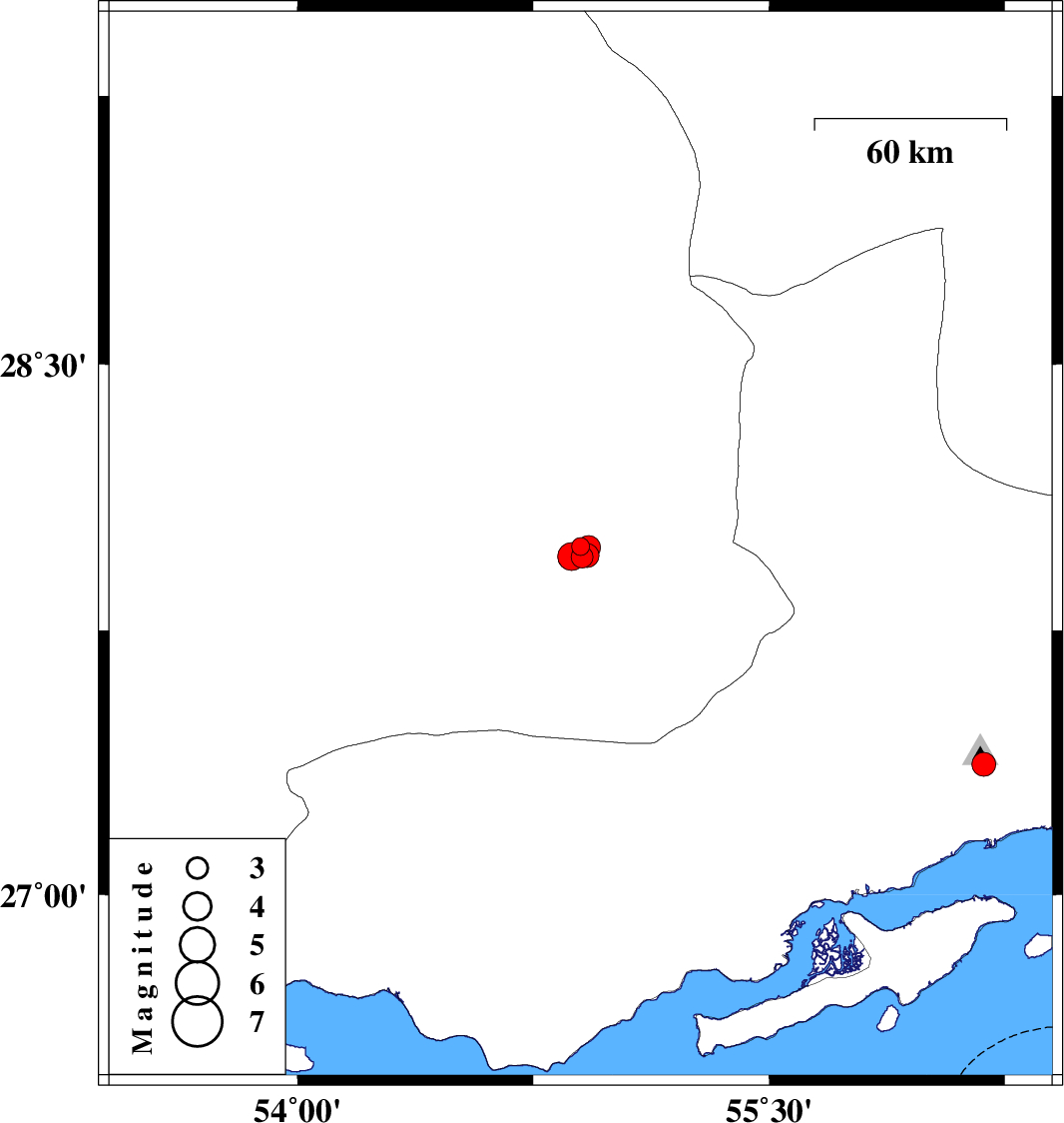 | 2017/04/28 | 13:00:44.8 | 17:30:44.8 | 27.958 | 54.871 | 15 | ML:3.9 | Fars Province, 61 km North-East of Lar | ||