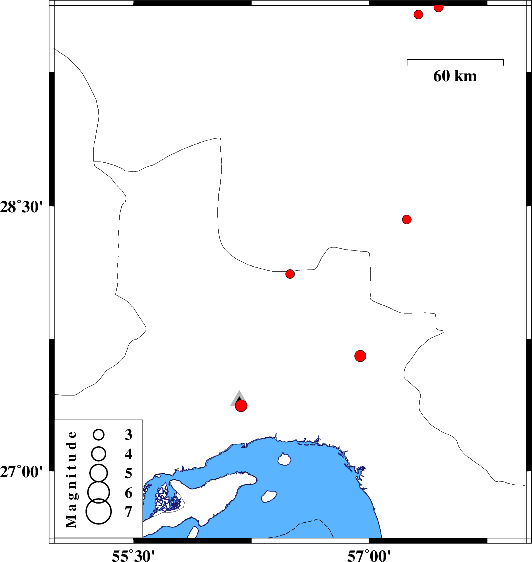 | 2017/04/28 | 05:07:08.3 | 09:37:08.3 | 27.652 | 56.944 | 14 | ML:3.2 | Hormozgan Province, 38 km North-West of Dehbarez | ||