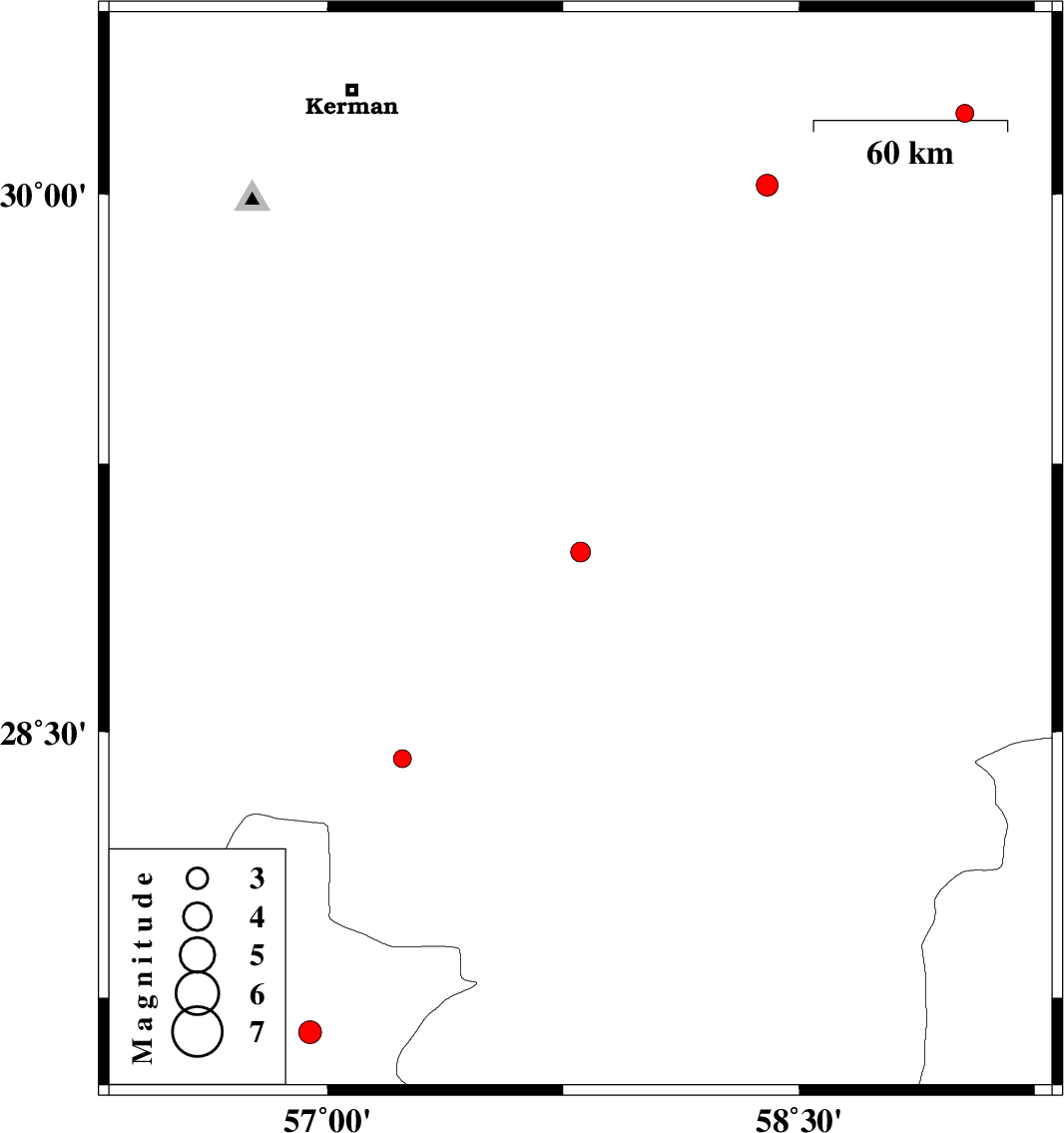 | 2017/04/25 | 12:40:01.8 | 17:10:01.8 | 28.424 | 57.239 | 14 | ML:2.6 | Kerman Province, 56 km South-West of Jiroft |