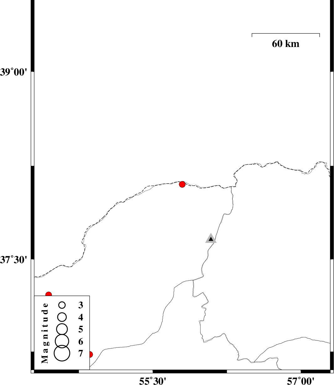 | 2017/05/03 | 06:28:40.2 | 10:58:40.2 | 36.727 | 54.86 | 6 | ML:2.8 | Golestan Province, 20 km South of Ali Abad | ||