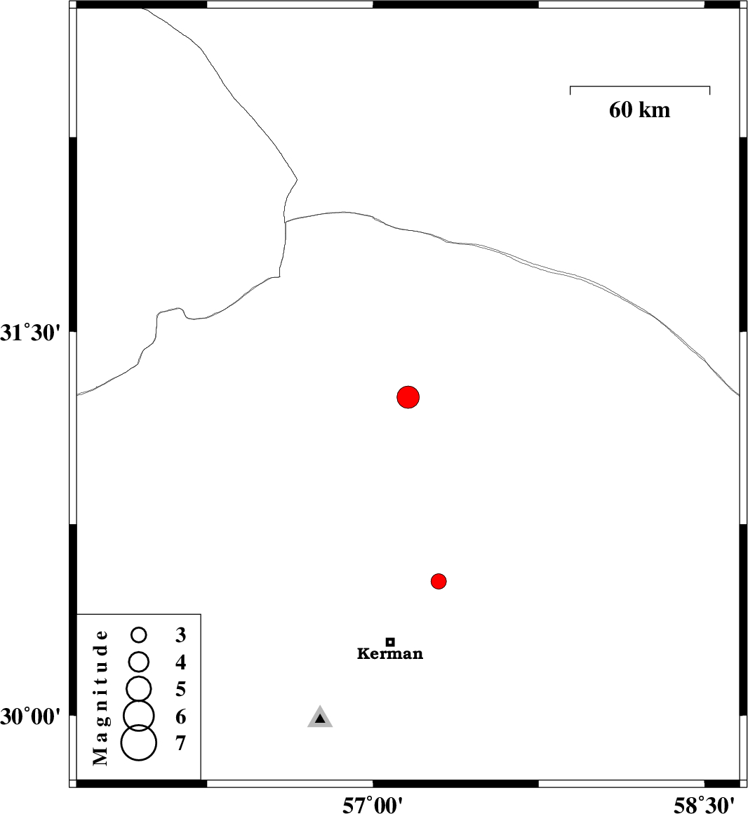 | 2017/05/08 | 16:35:32.2 | 21:05:32.2 | 30.526 | 57.298 | 14 | ML:3.1 | Kerman Province, 34 km North-East of Kerman |
