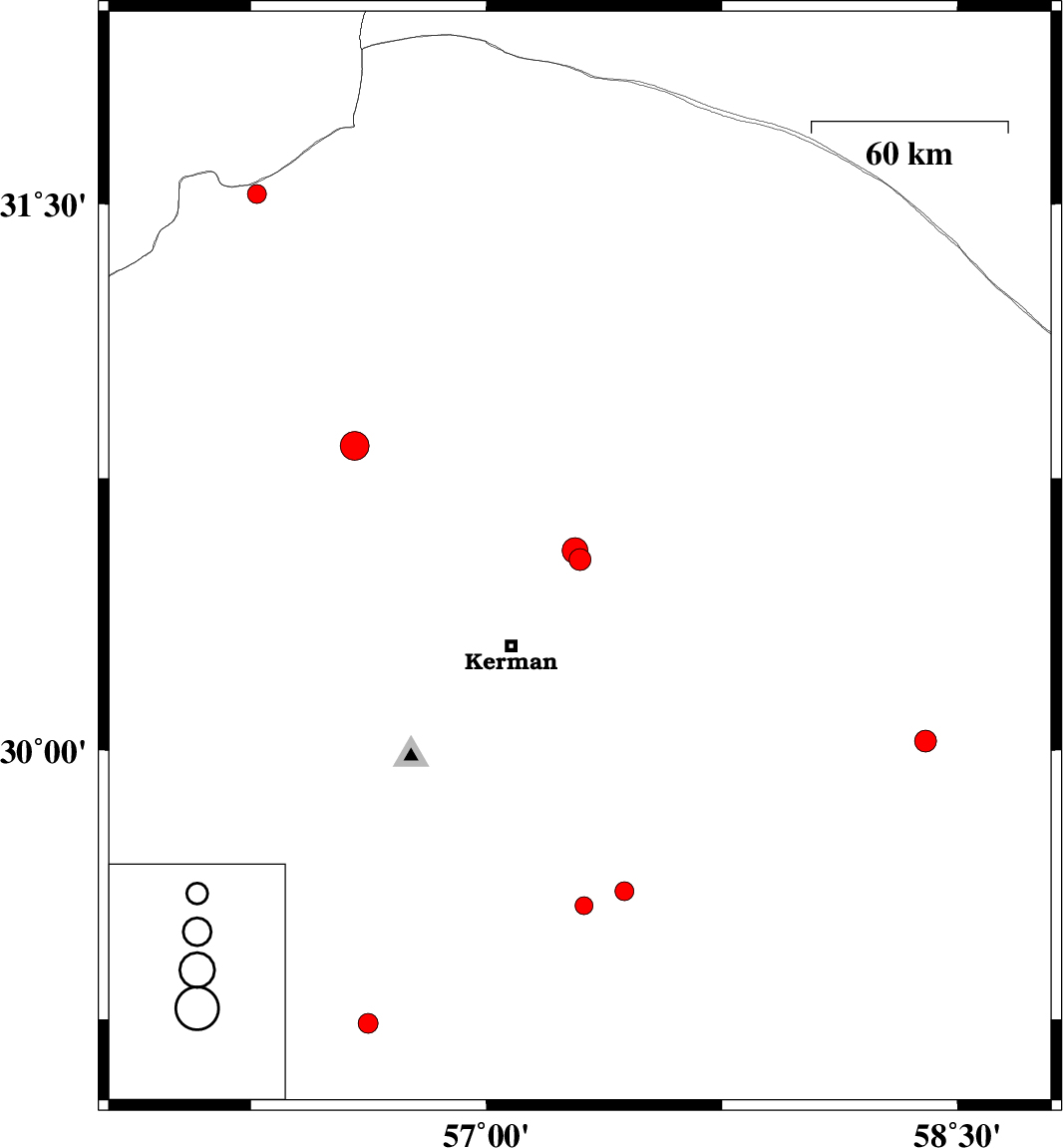 | 2017/04/20 | 05:40:16.7 | 10:10:16.7 | 30.55 | 57.283 | 15 | ML:3.6 | Kerman Province, 35 km North-East of Kerman | ||