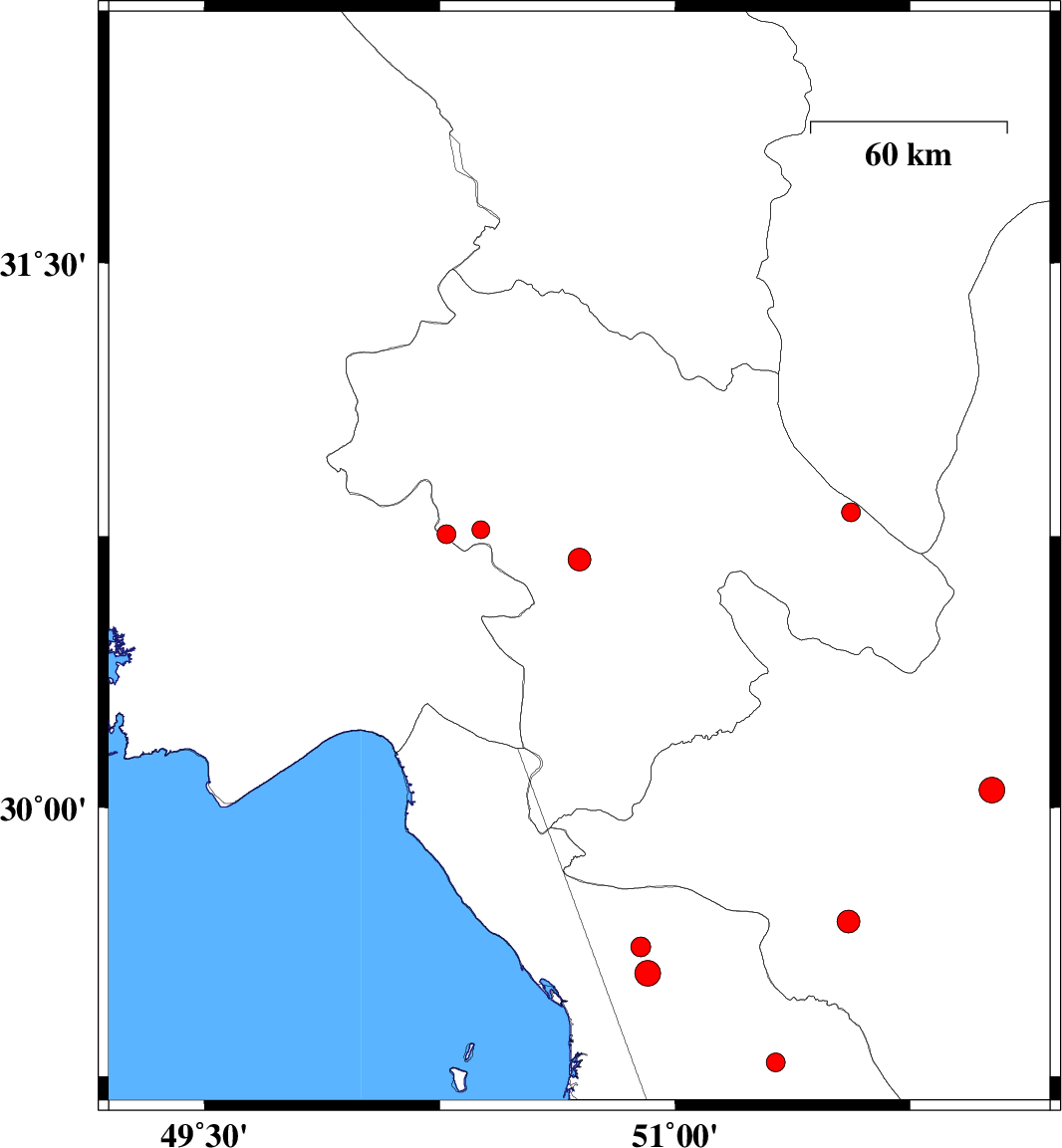 | 2017/05/10 | 17:02:26.2 | 21:32:26.2 | 29.29 | 51.321 | 15 | ML:2.7 | Bushehr Province, 12 km -East of Borazjan | ||