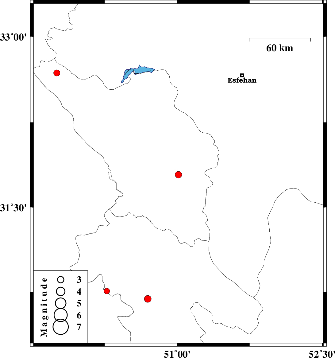 | 2017/05/14 | 09:01:59.1 | 13:31:59.1 | 32.683 | 49.754 | 14 | ML:2.9 | Chaharmahal Bakhtiari Province, 42 km North-West of Chelgard | ||
