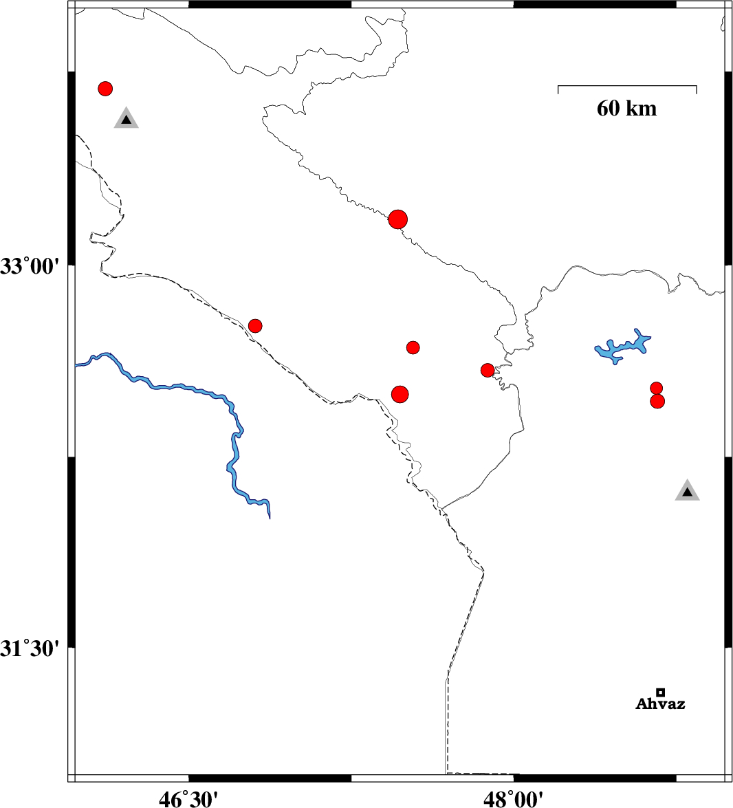 | 2017/04/21 | 17:32:43.4 | 22:02:43.4 | 32.678 | 47.534 | 14 | ML:2.7 | Ilam Province, 26 km -East of Dehloran |