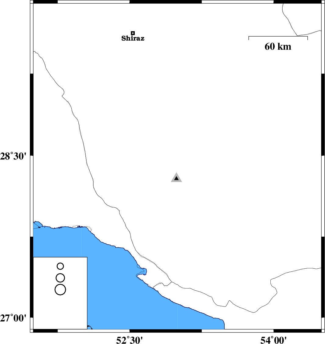 | 2017/05/17 | 14:25:26.6 | 18:55:26.6 | 28.39 | 52.996 | 15 | ML:2.6 | Fars Province, 9 km of Qir va Karzin |