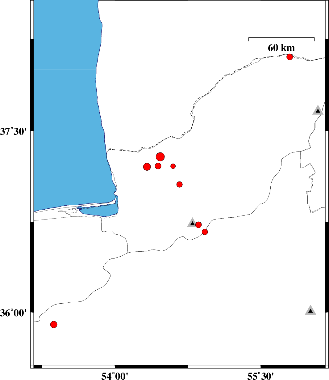 | 2017/05/03 | 06:28:40.2 | 10:58:40.2 | 36.727 | 54.86 | 6 | ML:2.8 | Golestan Province, 20 km South of Ali Abad | ||