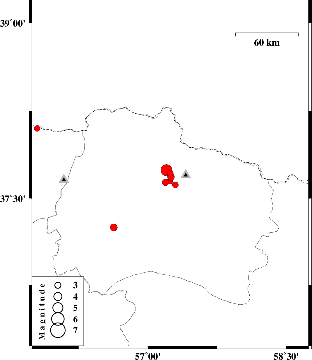 | 2017/04/24 | 15:18:16.8 | 19:48:16.8 | 37.248 | 56.631 | 15 | ML:3.5 | Khorasan(north) Province, 39 km North-East of Jajarm |