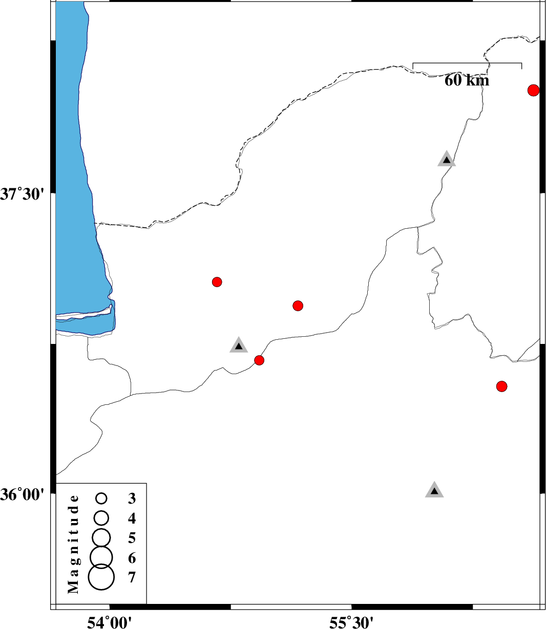 | 2017/05/17 | 13:12:13.5 | 17:42:13.5 | 36.538 | 56.43 | 6 | ML:2.9 | Semnan Province, 46 km South of Jajarm |