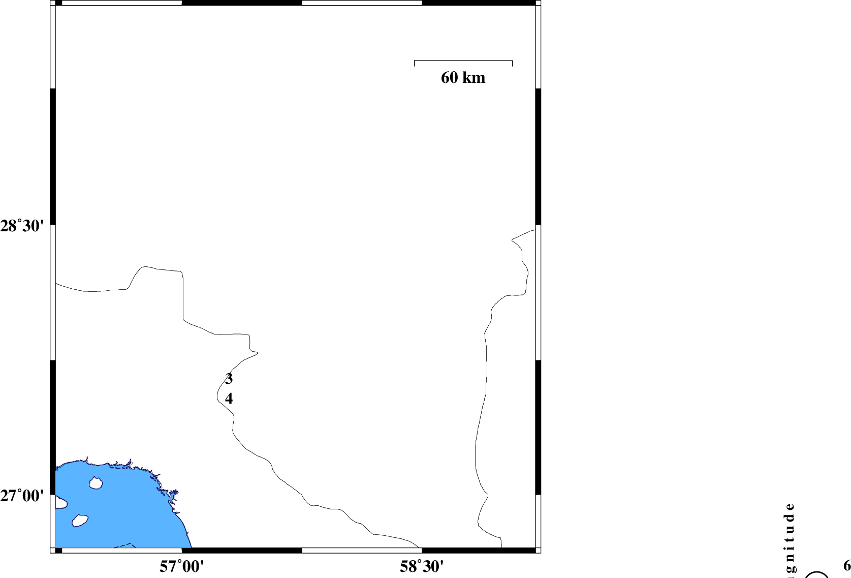 | 2017/05/19 | 05:29:10.7 | 09:59:10.7 | 27.846 | 57.604 | 14 | ML:2.9 | Kerman Province, 15 km South of Kahnuj | ||