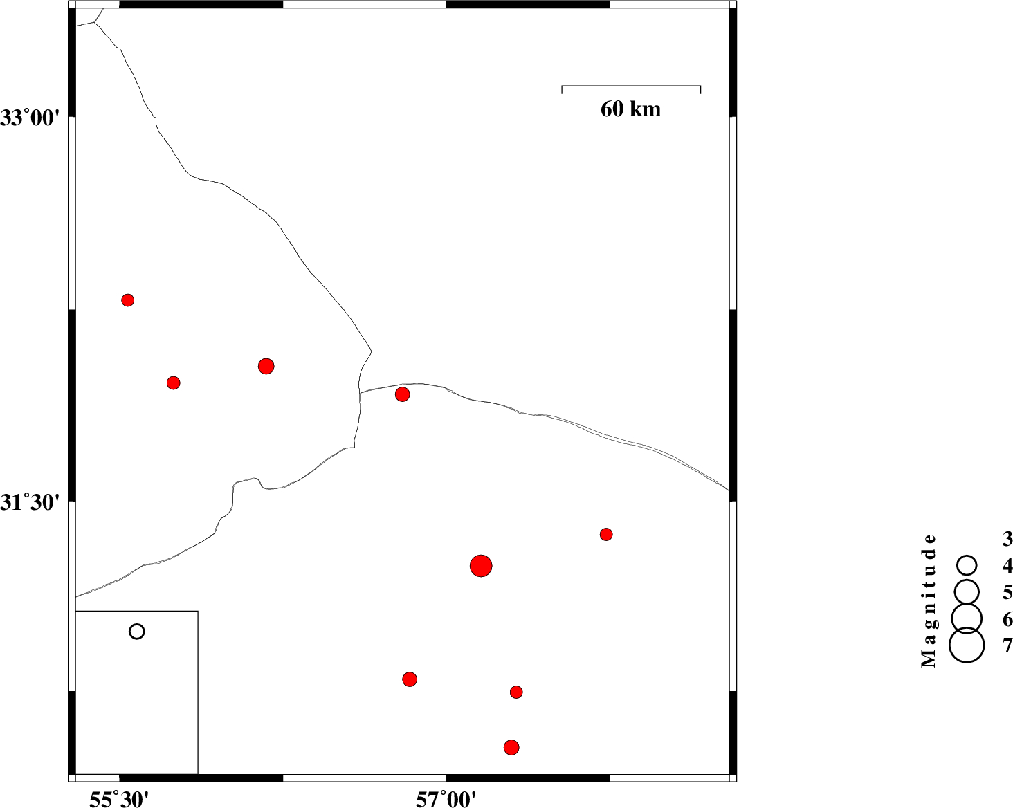 | 2017/05/11 | 01:26:57.1 | 05:56:57.1 | 32.029 | 56.173 | 14 | ML:3.3 | Yazd Province, 87 km North-East of Bafq | ||
