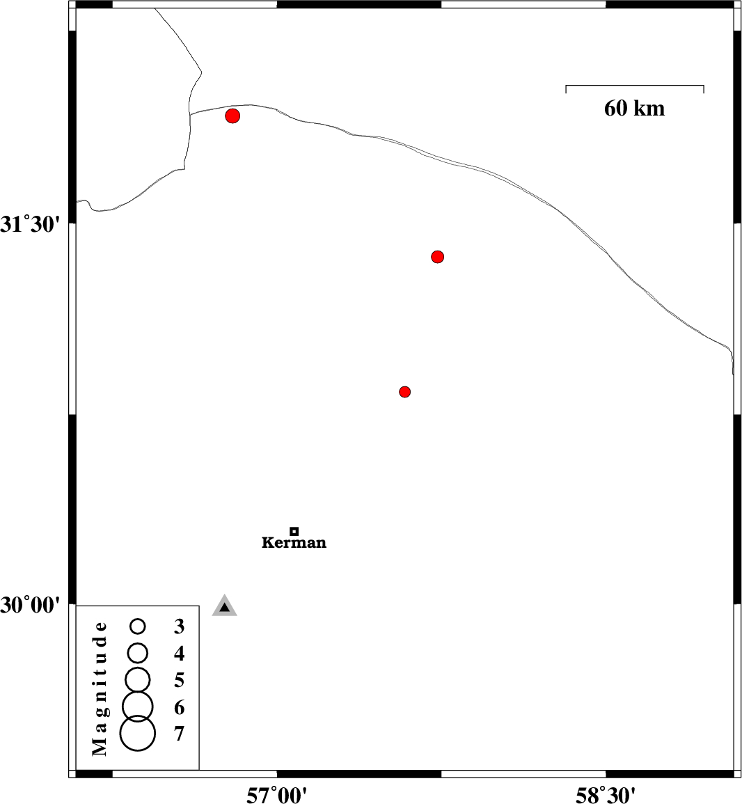 | 2017/05/30 | 09:37:56.6 | 14:07:56.6 | 30.838 | 57.583 | 15 | ML:2.2 | Kerman Province, 97 km -East of Zarand | ||