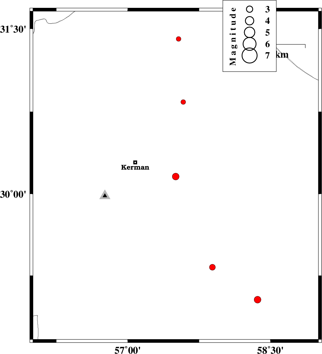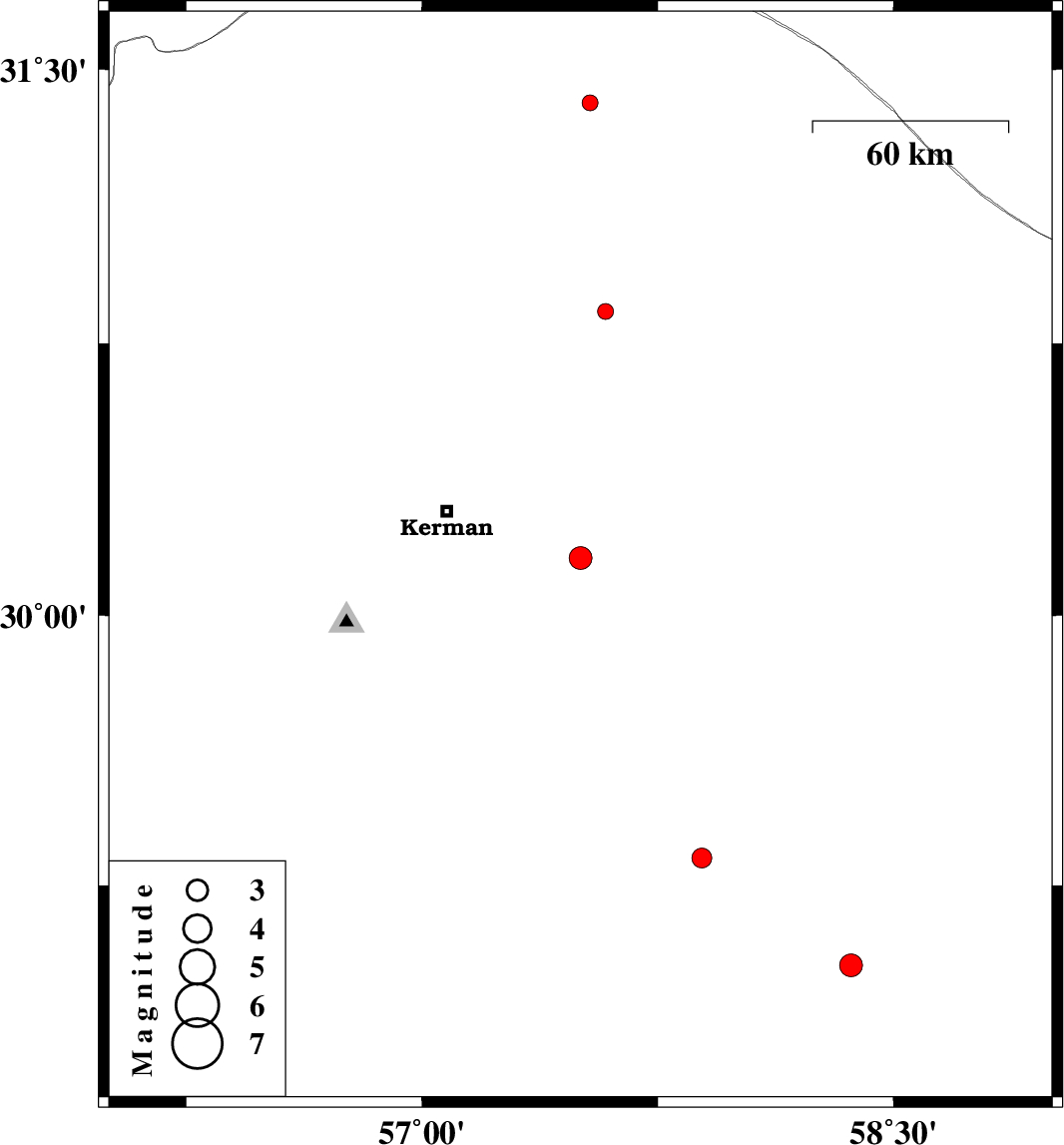 | 2017/06/05 | 15:34:22.0 | 20:04:22.0 | 30.159 | 57.504 | 14 | ML:3.2 | Kerman Province, 43 km South-East of Kerman | ||