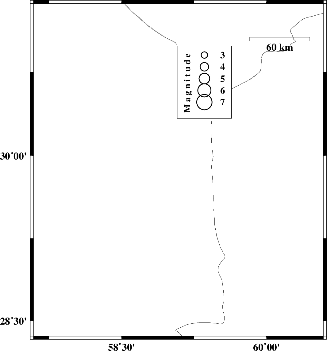 | 2017/06/10 | 04:34:56.1 | 09:04:56.1 | 29.812 | 59.041 | 14 | ML:2.9 | Kerman Province, 102 km North-East of Bam | ||