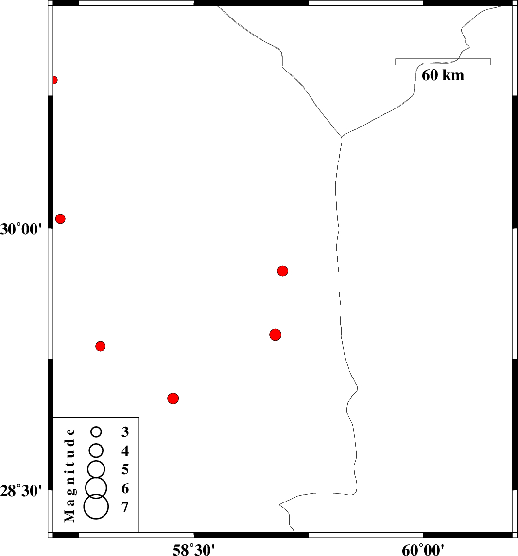 | 2017/06/09 | 22:20:10.8 | 02:50:10.8 | 29.756 | 59.08 | 14 | ML:3.1 | Kerman Province, 100 km North-East of Bam | ||