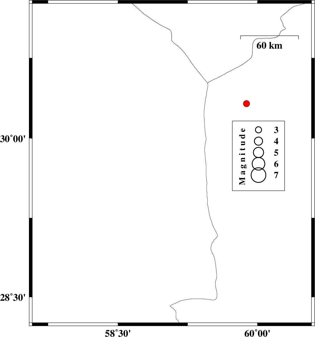 | 2017/06/09 | 22:20:10.8 | 02:50:10.8 | 29.756 | 59.08 | 14 | ML:3.1 | Kerman Province, 100 km North-East of Bam | ||