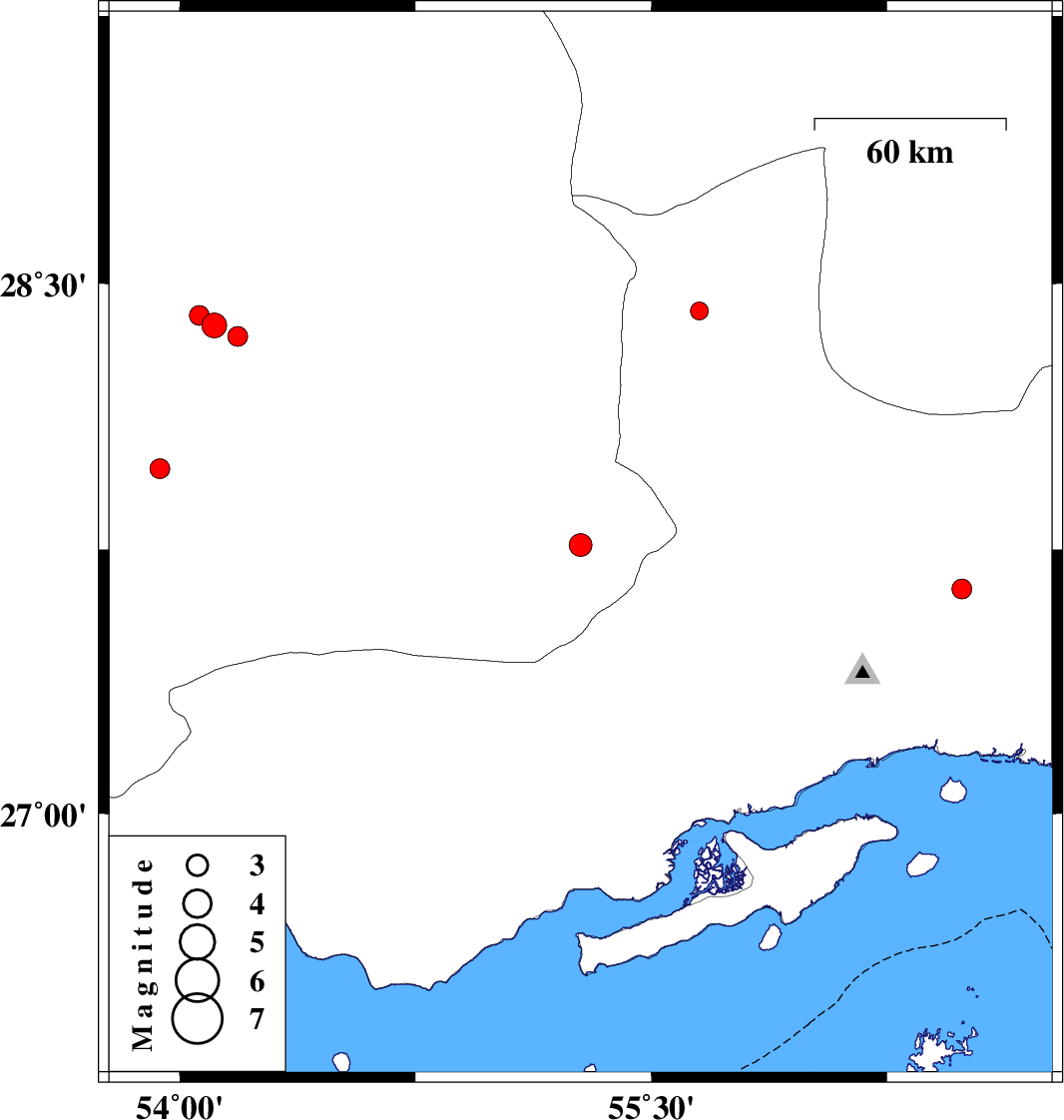 | 2017/06/02 | 12:11:57.8 | 16:41:57.8 | 28.382 | 54.11 | 7 | ML:3.5 | Fars Province, 55 km South-East of Jahrom | ||