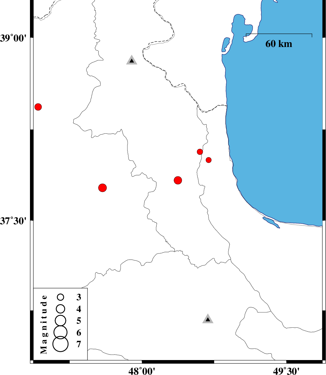 | 2017/06/11 | 08:07:13.3 | 12:37:13.3 | 37.832 | 48.373 | 15 | ML:3.7 | Ardebil Province, 15 km North of Givi | ||