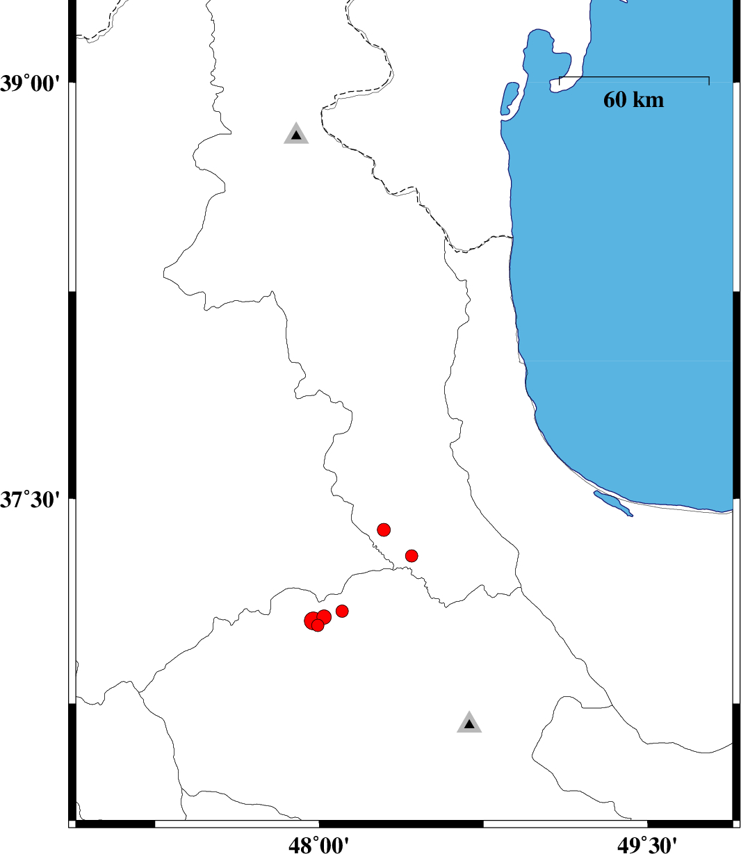 | 2017/06/11 | 08:07:13.3 | 12:37:13.3 | 37.832 | 48.373 | 15 | ML:3.7 | Ardebil Province, 15 km North of Givi | ||