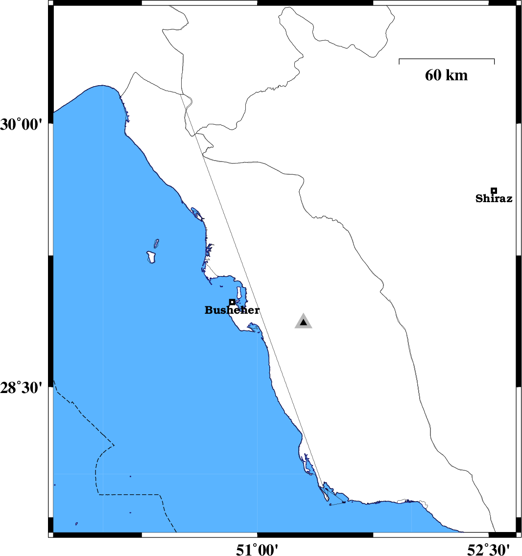 | 2017/06/07 | 06:58:45.1 | 11:28:45.1 | 28.258 | 52.483 | 30 | ML:3 | Fars Province, 50 km North-East of Jam |