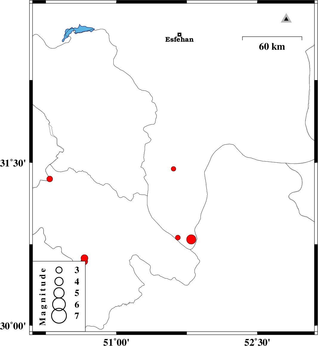 | 2017/06/25 | 02:55:18.9 | 07:25:18.9 | 31.443 | 51.608 | 14 | ML:2.3 | Esfahan Province, 5 km of Semirom | ||