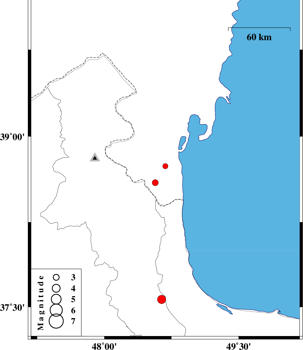 | 2017/06/23 | 19:35:32.8 | 00:05:32.8 | 38.596 | 48.569 | 23 | ML:3.1 | Azerbaijan, 20 km North-East of Namin |