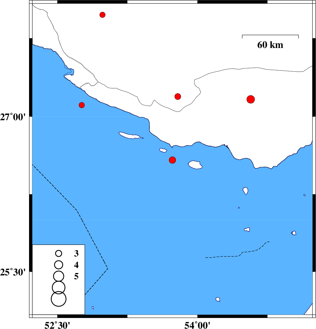 | 2017/06/27 | 03:34:52.7 | 08:04:52.7 | 27.192 | 53.789 | 14 | ML:3 | Fars Province, 57 km -West of Bastak | ||