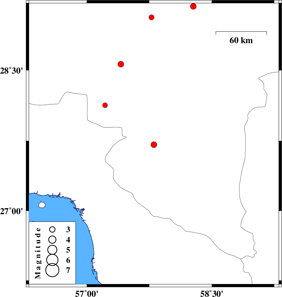 | 2017/06/29 | 16:43:49.3 | 21:13:49.3 | 28.13 | 57.22 | 16 | ML:2.7 | Kerman Province, 51 km North-West of Kahnuj | ||