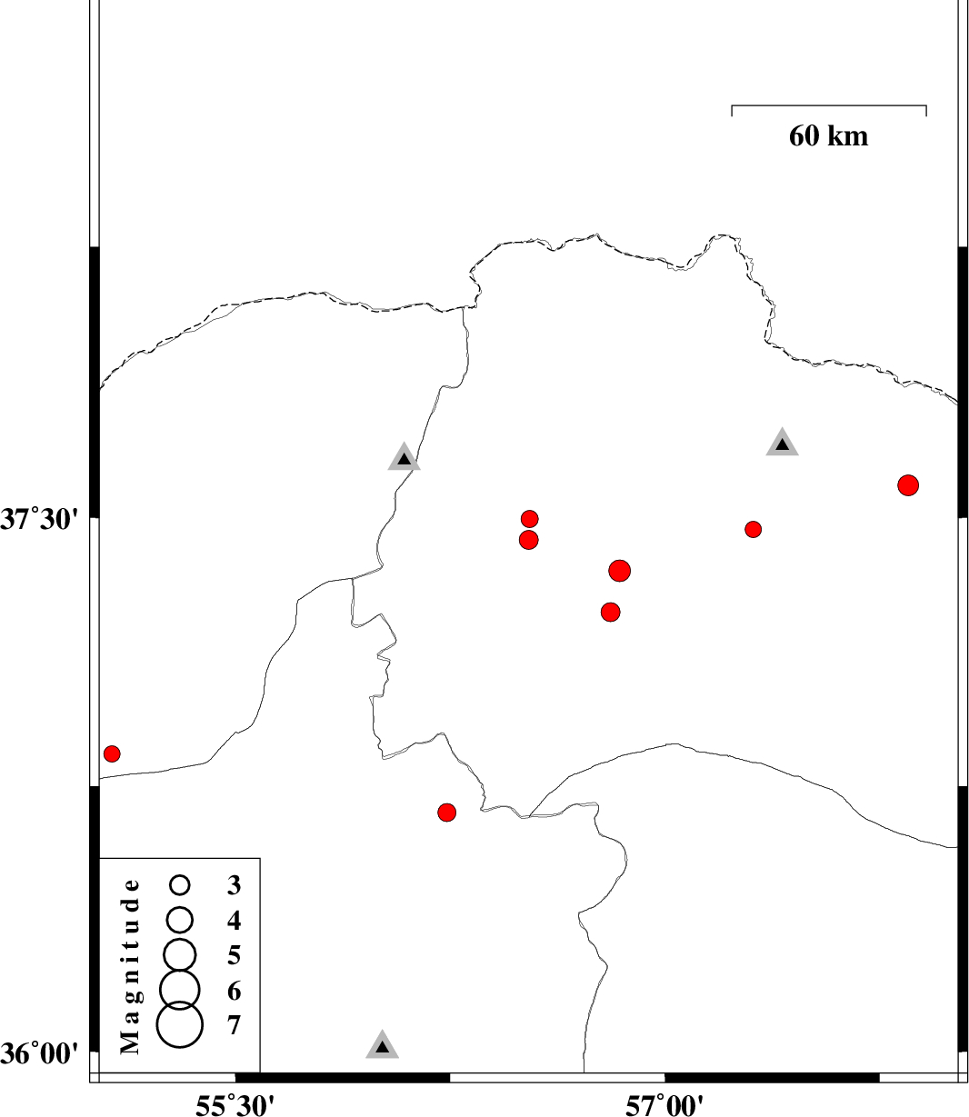 | 2017/06/28 | 11:19:30.4 | 15:49:30.4 | 37.237 | 56.81 | 6 | ML:2.9 | Khorasan(north) Province, 37 km South-West of Ashkhaneh | ||