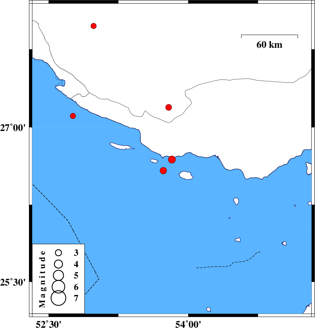 | 2017/07/02 | 06:19:50.3 | 10:49:50.3 | 26.688 | 53.824 | 14 | ML:3.5 | Persian Gulf, 78 km South-West of Bastak | ||
