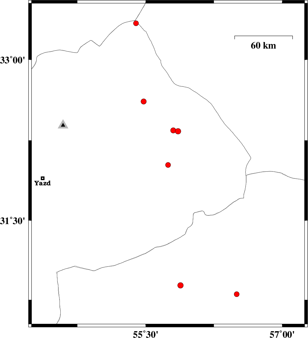 | 2017/06/16 | 07:23:02.5 | 11:53:02.5 | 32.344 | 55.803 | 16 | ML:2.7 | Yazd Province, 91 km North-East of Bafq | ||