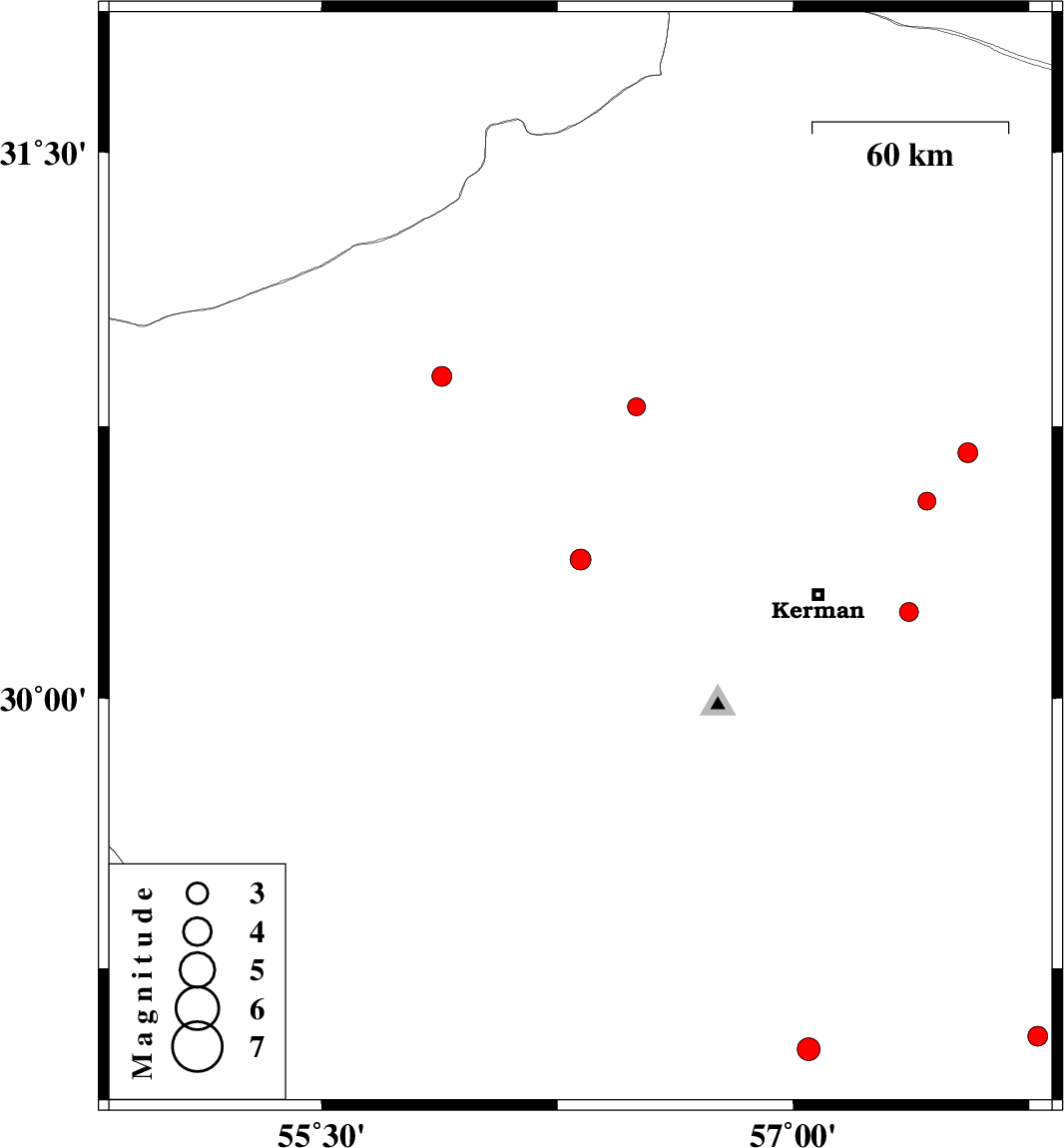 | 2017/06/30 | 14:10:52.9 | 18:40:52.9 | 30.887 | 55.882 | 14 | ML:2.8 | Kerman Province, 55 km North-West of Rafsanjan | ||