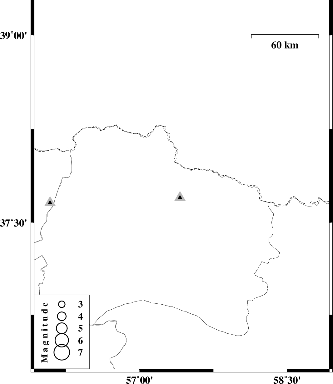 | 2017/07/07 | 18:48:00.1 | 23:18:00.1 | 37.805 | 57.428 | 14 | ML:2.7 | Khorasan(north) Province, 38 km North of Bojnurd |