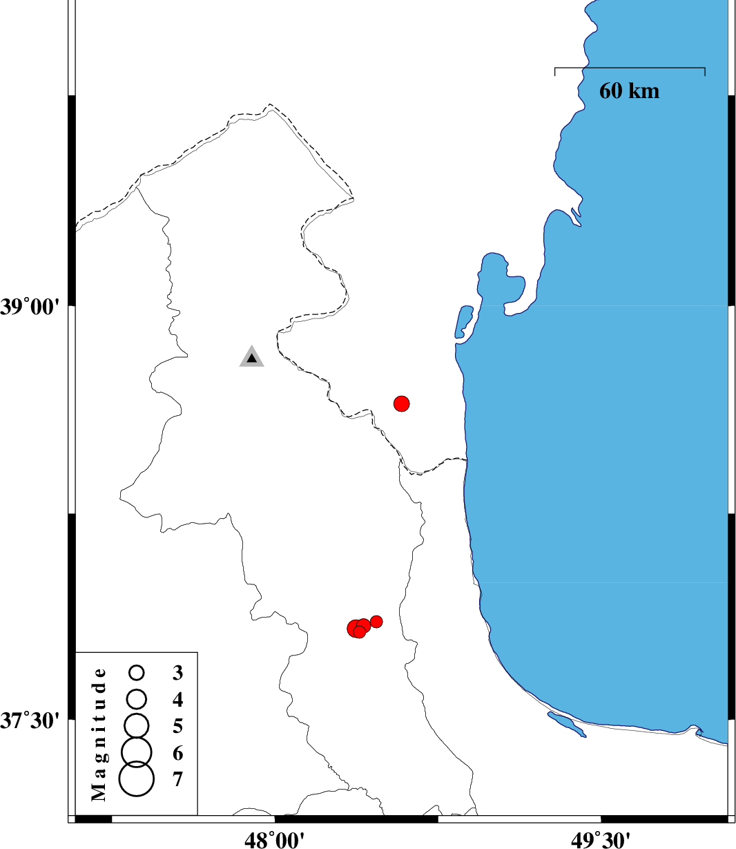 | 2017/06/11 | 08:07:13.3 | 12:37:13.3 | 37.832 | 48.373 | 15 | ML:3.7 | Ardebil Province, 15 km North of Givi |