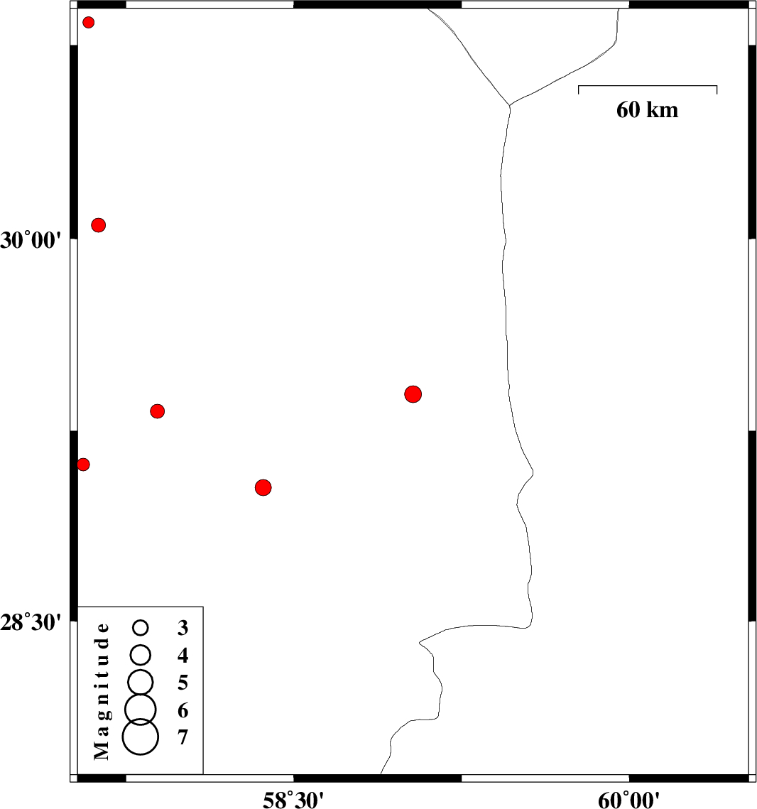 | 2017/05/26 | 17:09:03.9 | 21:39:03.9 | 28.061 | 57.777 | 18 | ML:2.9 | Kerman Province, 15 km North of Kahnuj | ||