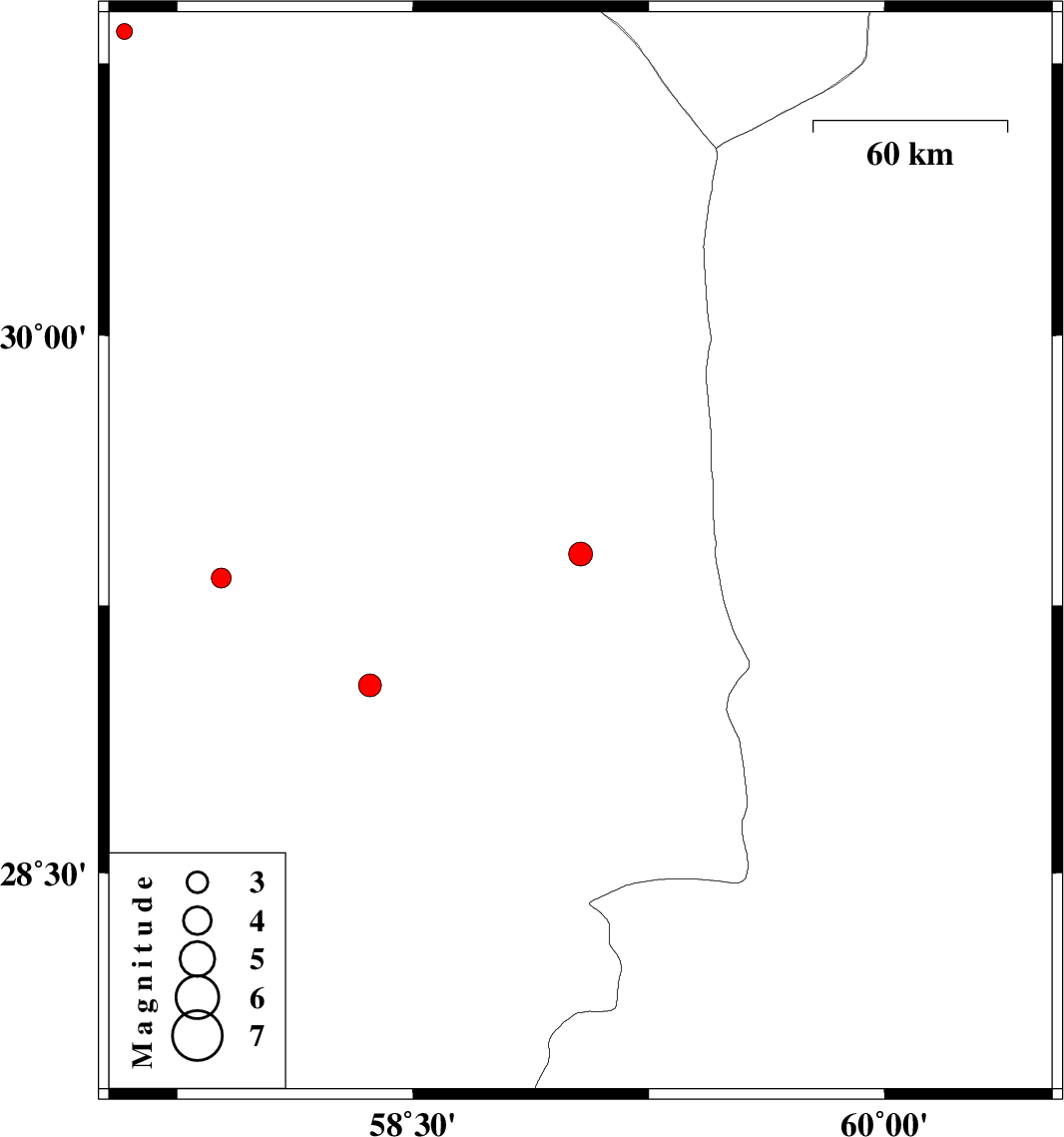 | 2017/06/01 | 11:42:48.6 | 16:12:48.6 | 29.027 | 58.364 | 14 | ML:3.3 | Kerman Province, 9 km of Bam | ||