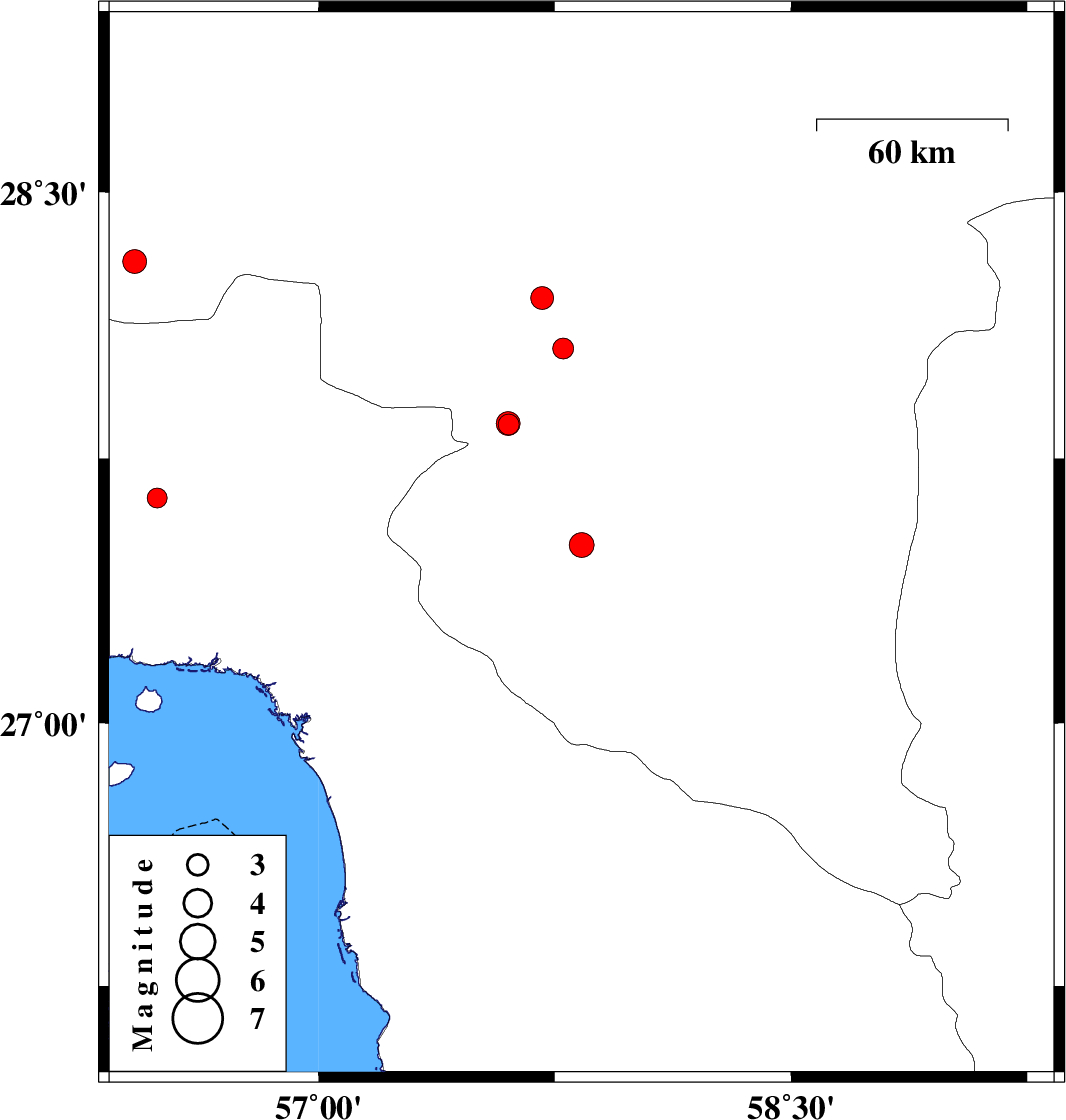 | 2017/05/19 | 05:29:10.7 | 09:59:10.7 | 27.846 | 57.604 | 14 | ML:2.9 | Kerman Province, 15 km South of Kahnuj | ||