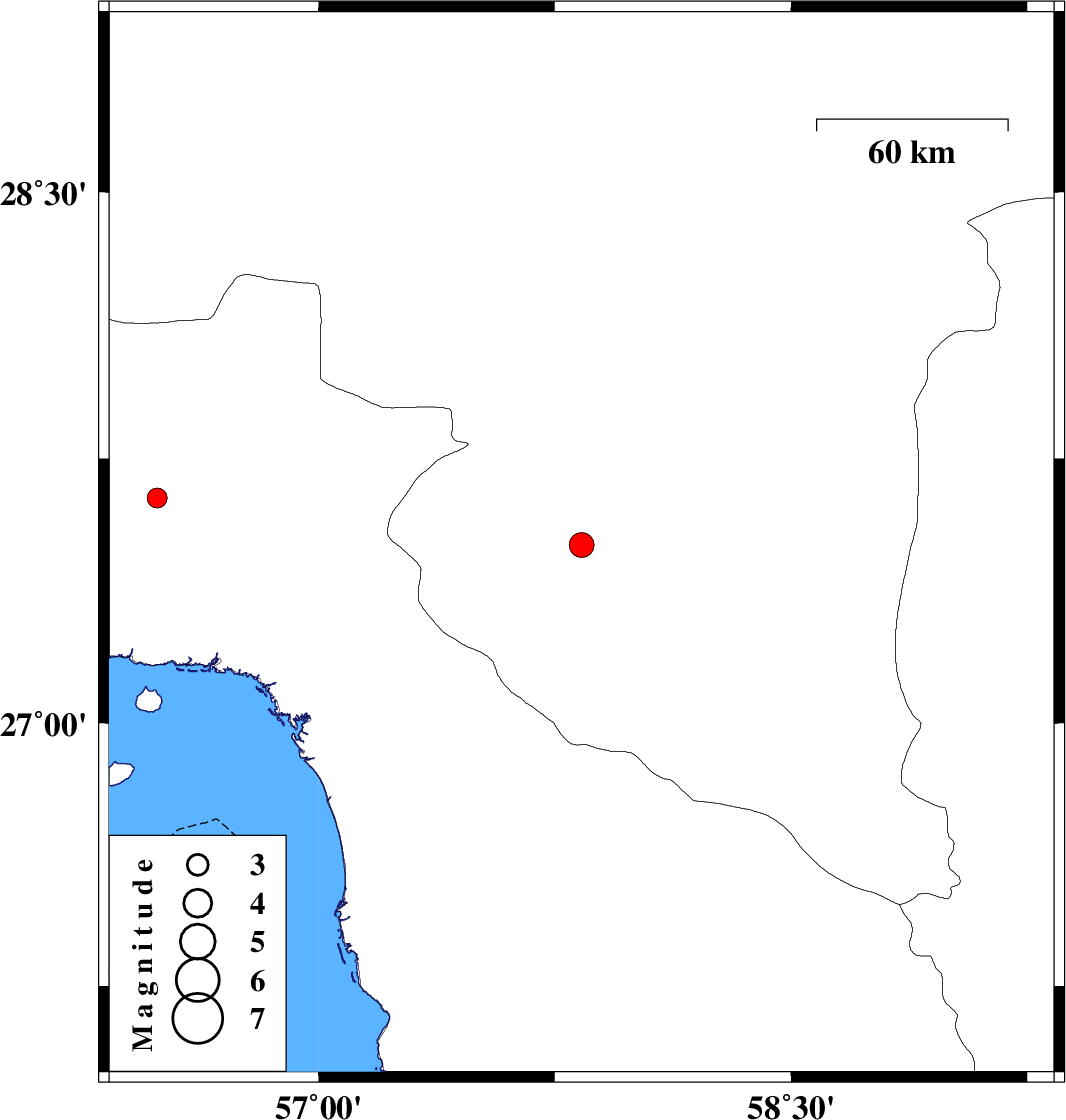 | 2017/06/04 | 10:01:00.7 | 14:31:00.7 | 27.505 | 57.835 | 14 | ML:3.5 | Kerman Province, 35 km -East of Manujan | ||