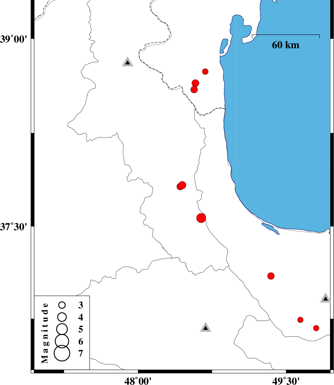 | 2017/07/13 | 03:17:03.2 | 07:47:03.2 | 37.833 | 48.448 | 14 | ML:3.4 | Ardebil Province, 16 km North of Givi | ||