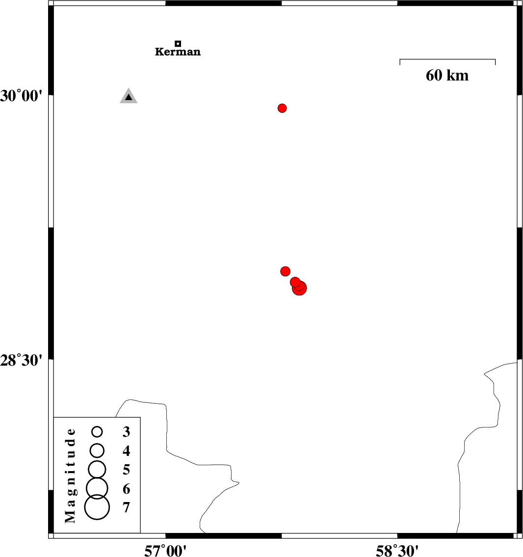 | 2017/07/15 | 18:18:15.5 | 22:48:15.5 | 28.906 | 57.865 | 14 | ML:4.2 | Kerman Province, 29 km North-East of Jiroft | ||