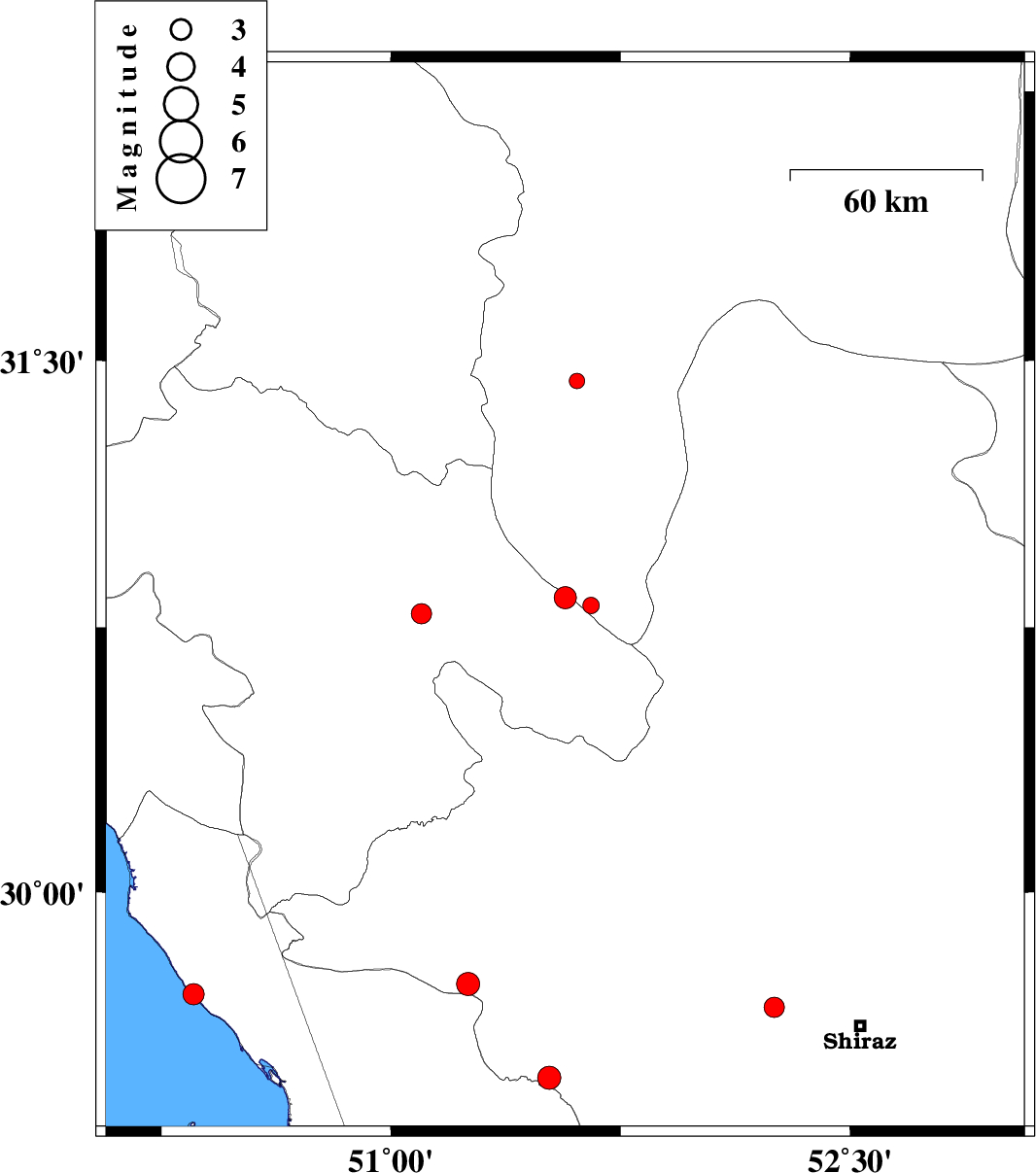 | 2017/07/06 | 21:50:56.5 | 02:20:56.5 | 29.739 | 51.251 | 15 | ML:3.4 | Fars Province, 41 km North-West of Kazerun | ||