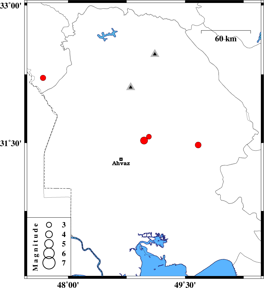 | 2017/07/21 | 07:42:48.5 | 12:12:48.5 | 31.527 | 48.973 | 15 | ML:4.2 | Khoozestan Province, 36 km North-East of Ahvaz | ||