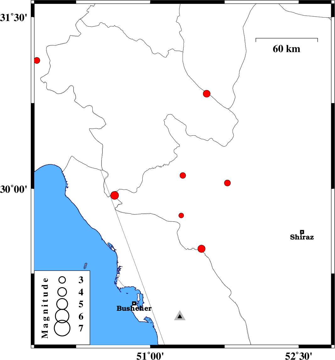 | 2017/07/19 | 07:03:41.0 | 11:33:41.0 | 29.941 | 50.64 | 18 | ML:3.6 | Fars Province, 43 km North-East of Bandar-e genaveh | ||