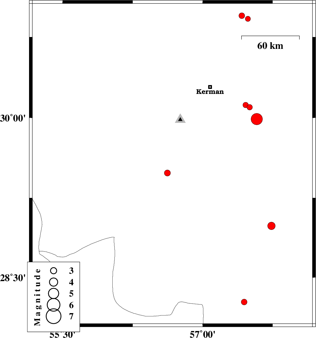 | 2017/07/23 | 17:32:12.3 | 22:02:12.3 | 30.065 | 57.634 | 11 | Mb:5.5 | Kerman Province, 59 km South-East of Kerman | ||