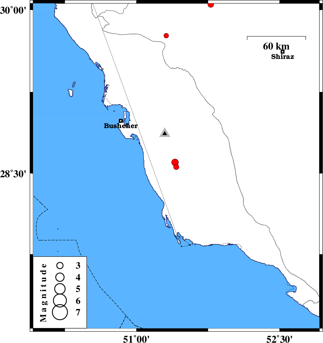 | 2017/07/29 | 14:29:56.1 | 18:59:56.1 | 28.559 | 51.417 | 15 | ML:2.6 | Bushehr Province, 11 km of Khormog | ||