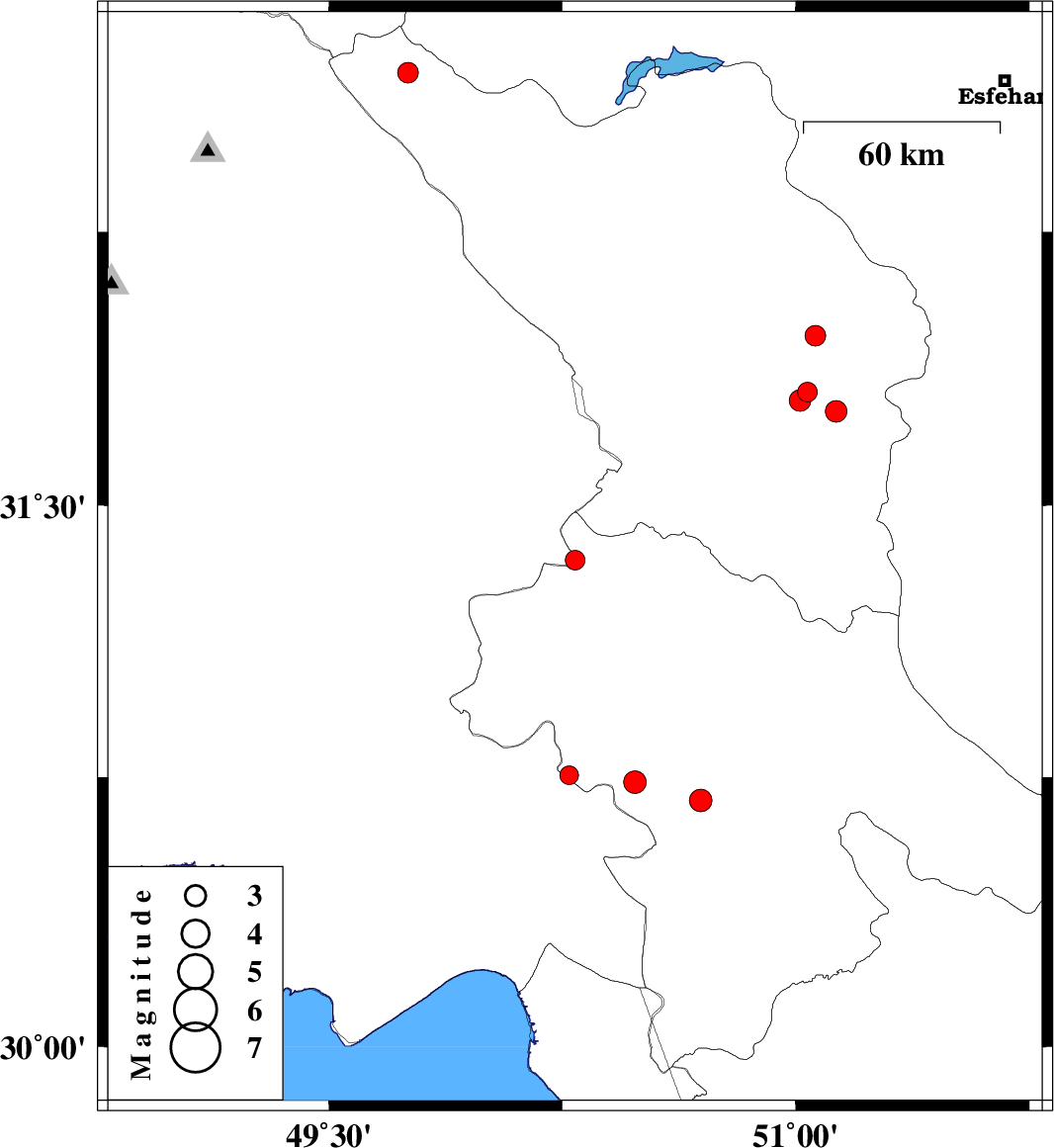 | 2017/05/15 | 02:00:15.5 | 06:30:15.5 | 31.966 | 51.063 | 14 | ML:2.9 | Chaharmahal Bakhtiari Province, 21 km -West of Borujen | ||