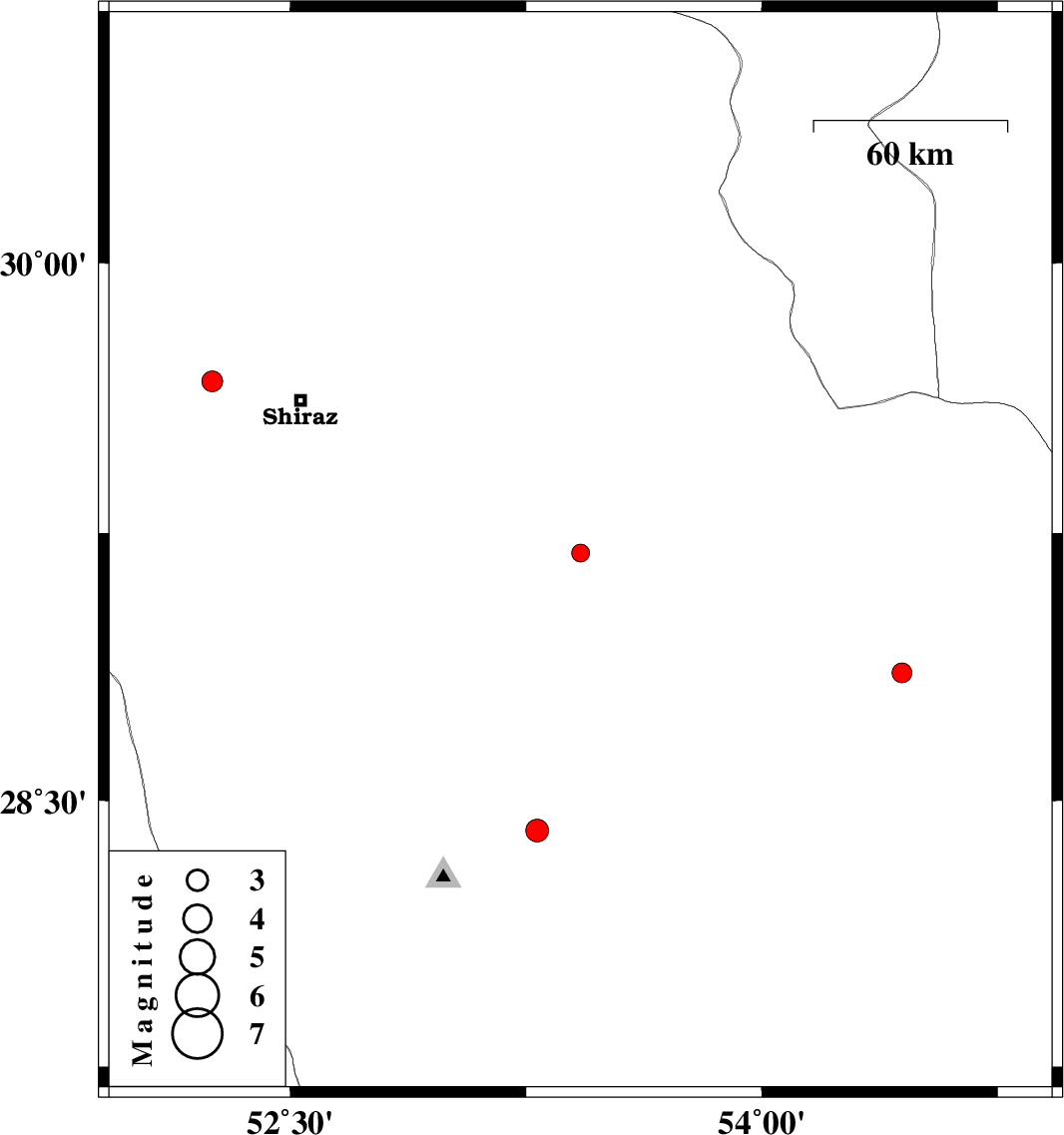 | 2017/07/27 | 02:50:43.6 | 07:20:43.6 | 28.416 | 53.285 | 6 | ML:3.2 | Fars Province, 25 km -East of Qir va Karzin | ||